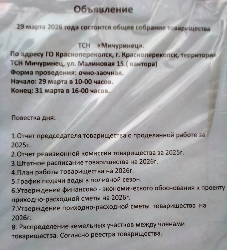 29 марта 2026 года состоится общее собрание товарищества ТСН «Мичуринец».